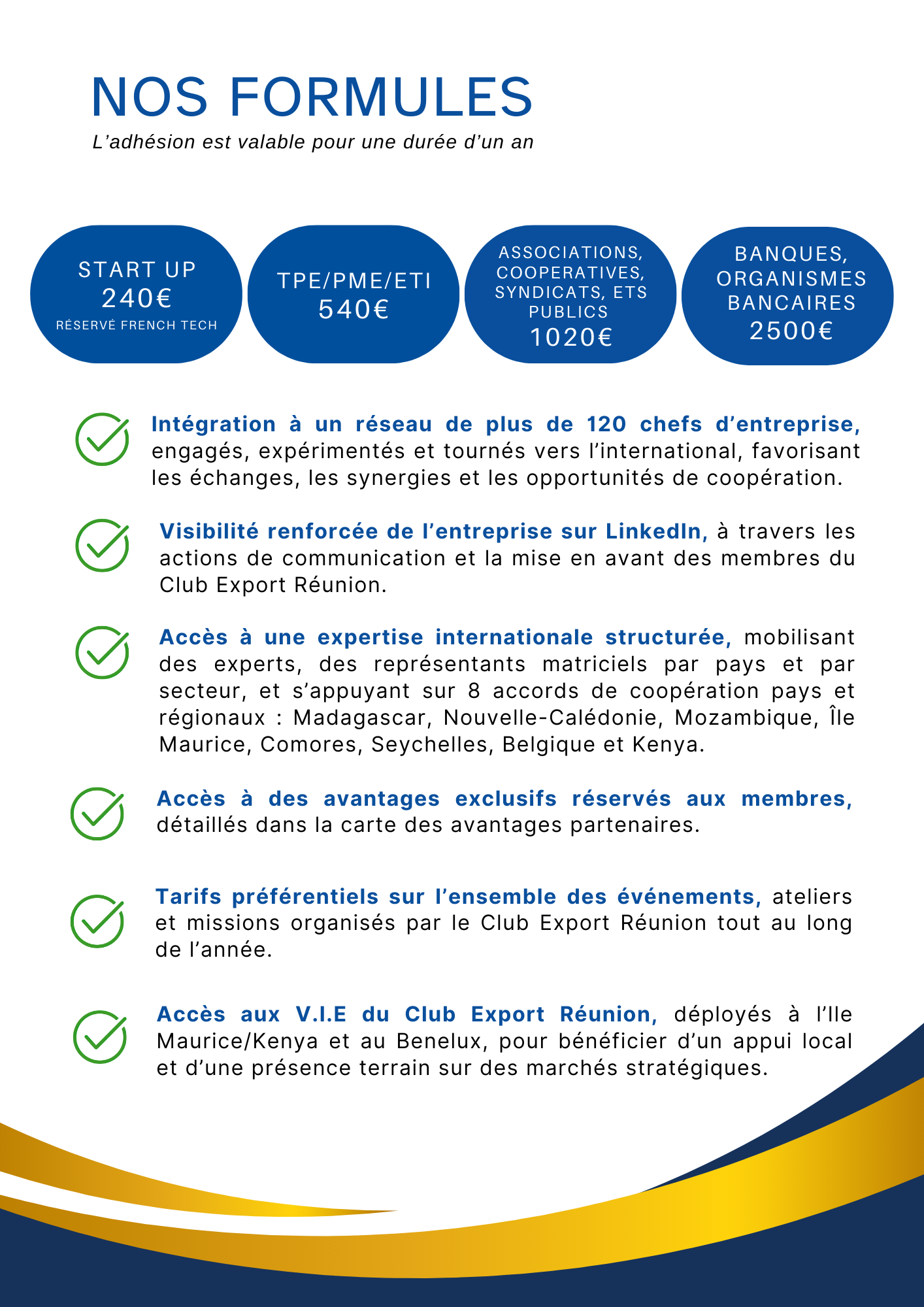 Que vous soyez une entreprise de biens ou de services, le Club Export Réunion vous propose des formules d’accompagnement adaptées au degré de maturité à l’export de votre entreprise.